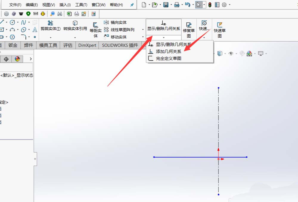 4、之后在草图里面找到显示/删除几何关系,下拉找到添加几何关系。