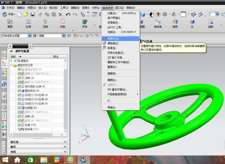 1、当我们完成自己的UG设计后,点击菜单栏的首选项,在弹出的下拉菜单中选择可视化,如图所示: