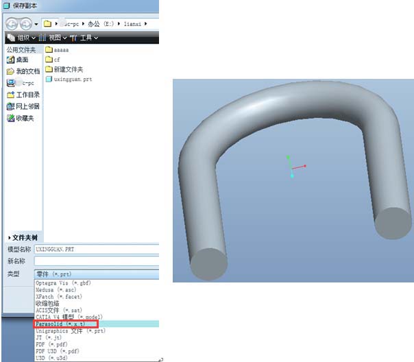 1、几何模型转换格式。Pro/E软件中建好模型后,另存为Parasolid(*.x_t)格式或者其它中间格式如stp、catia、igs、stl等,如下图所示。