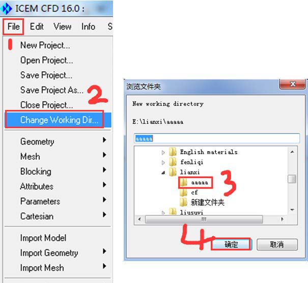 2、设定工作目录。打开ICEM,依次点击“file”-“change working dir”,弹出框中选好存储路径,点击“确定”。注意此时可顺手将步骤1导出的文件放置在该目录下,便于后续导入。