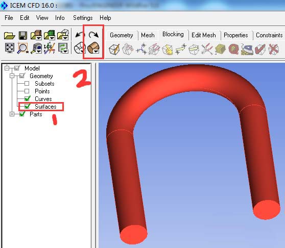 5、检查导入是否成功。几何模型刚导入时,默认是线显示,不显示面,不够直观,不容易检查是否导入成功。要先打开surfaces的显示开关,下图步骤1;然后将面显示打开,下图步骤2。检查是否导入成功,主要是看面是否残缺,安装关系是否改变(常见于装配体)。若导入失败,可尝试换成其它格式igs、catia等,一般情况下总有一个格式可以导入成功的。