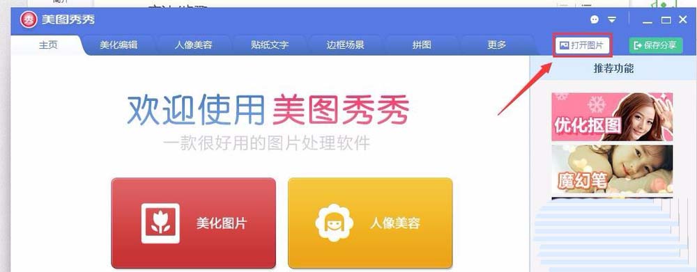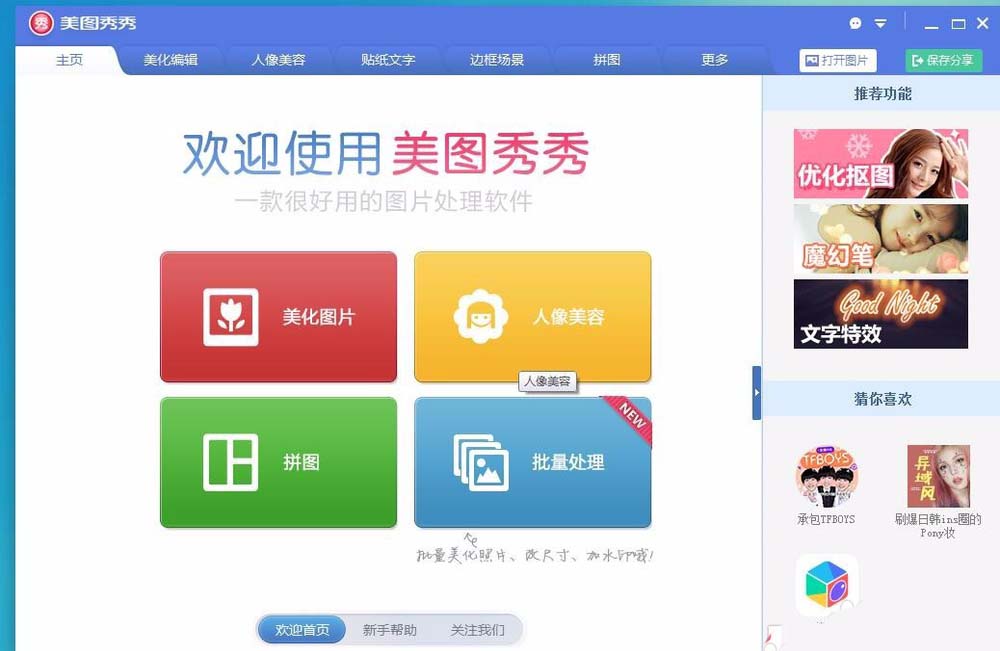1、打开美图秀秀这款软件,进入美图秀秀的操作界面,如图所示: