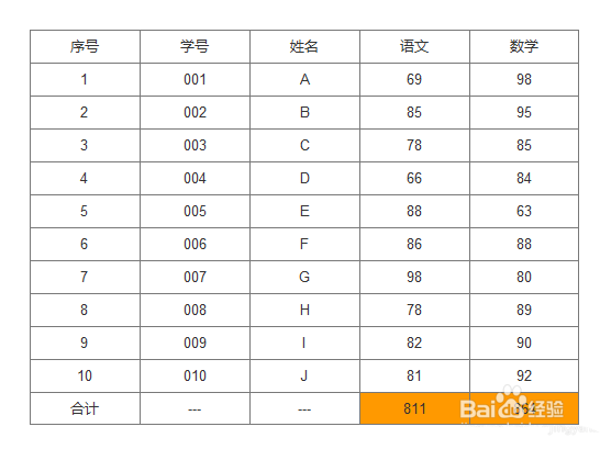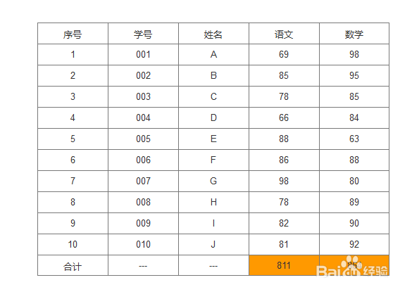 4、将最后一行作为合计行,第一列最后一行为“合计”,接着是“---”,最后两列为语文和数学的合计,如下图所示: