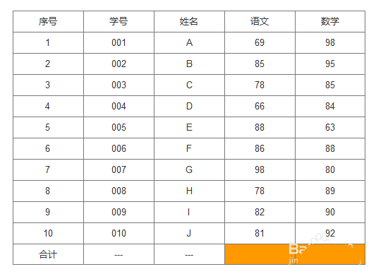 6、将语文和数学最后一行进行合计,统计出前十条记录的合计,如下图所示: