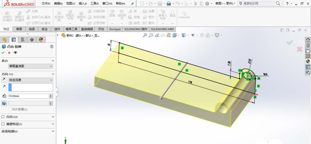 1、打开SolidWorks,新建一个零件模型。在前视基准面上绘制草图,创建拉伸特征,如图所示。
