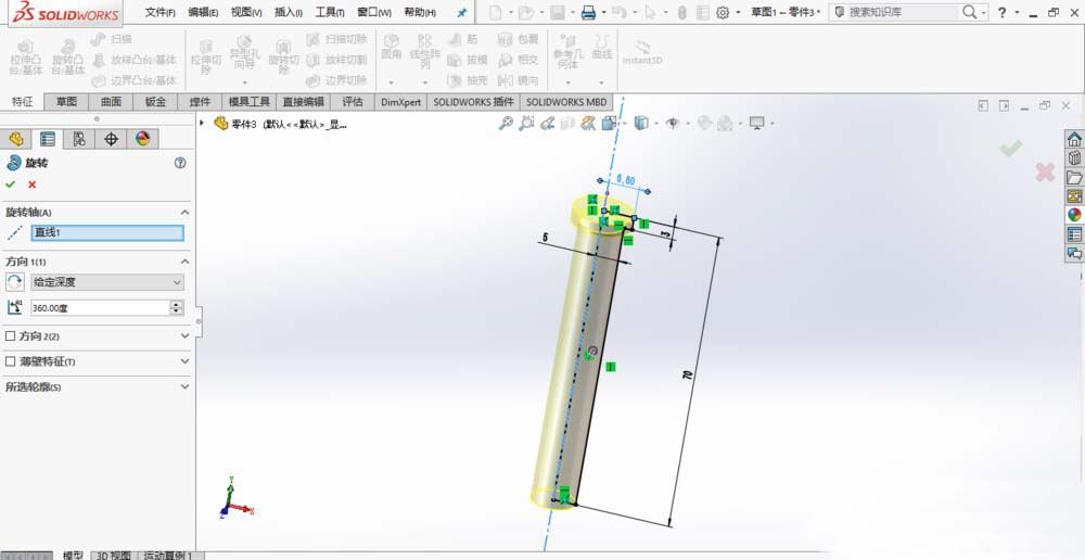 1、新建一个零件模型。在前视基准面上绘制草图,创建旋转特征,如图所示。