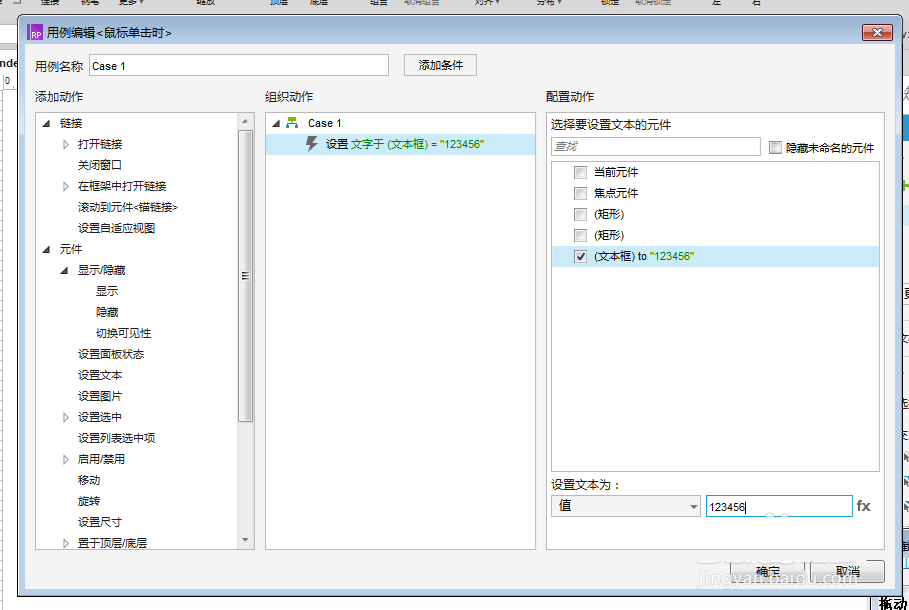 3、选中“明文”按钮,添加鼠标单击事件用例,单击时文本框显示“123456”,如下图所示: