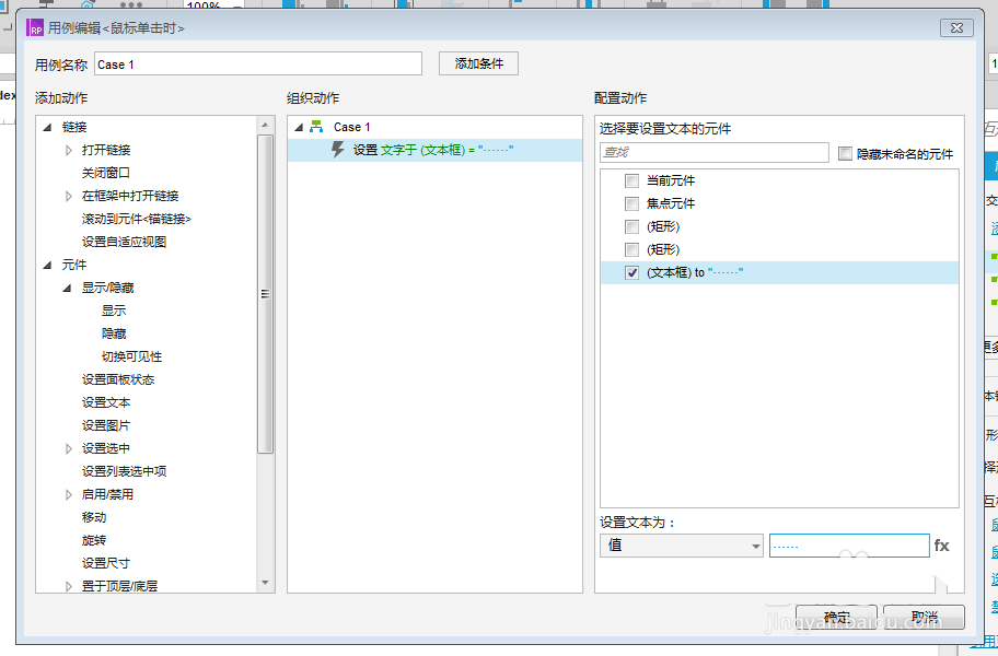 4、选中“暗文”按钮,添加鼠标单击事件用例,单击时文本框显示“......”,如下图所示: