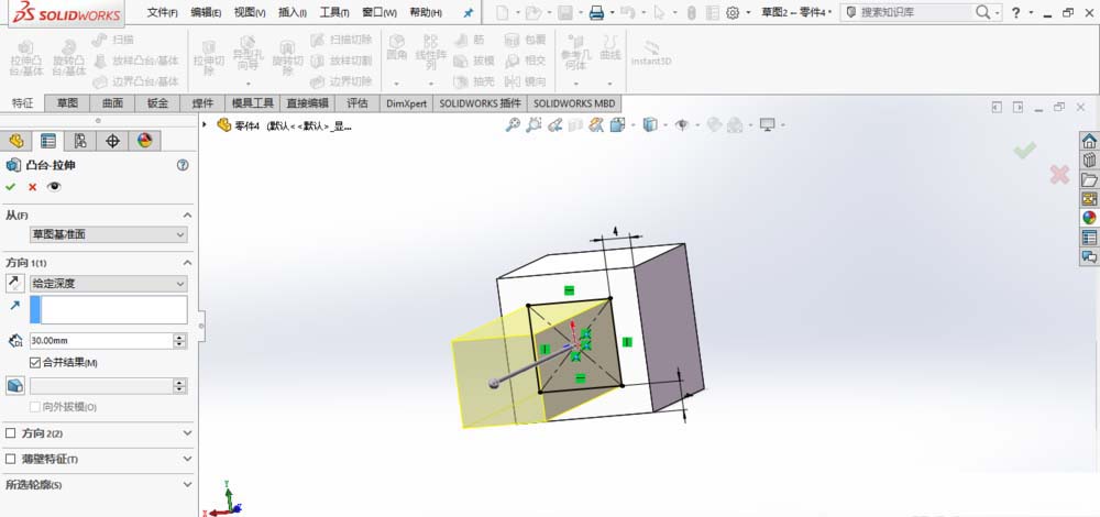 1、打开SolidWorks,新建一个零件模型。创建凸台-拉伸1,如图所示。