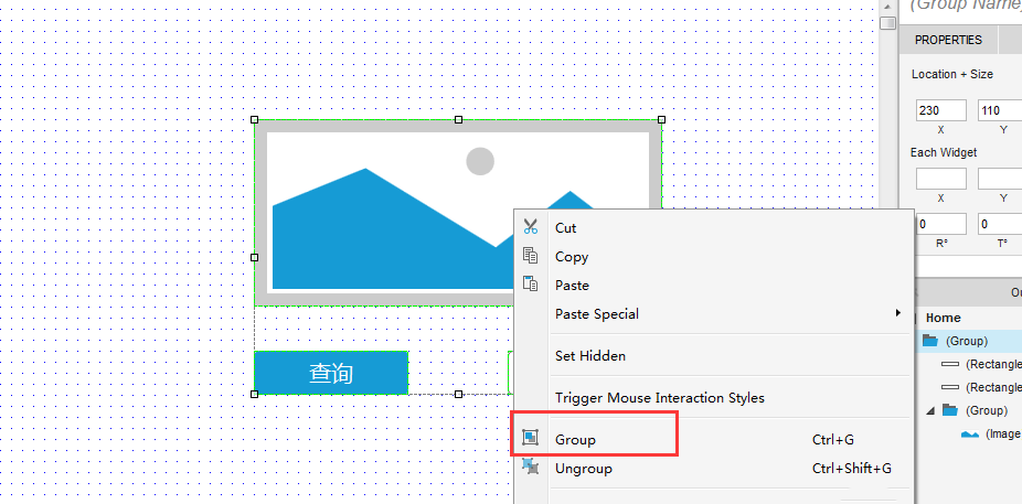 4、选中第三步中的三个元素,鼠标右键选择“Group”,进行元素对象组合,如下图所示: