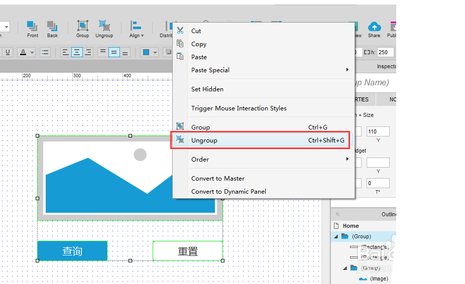 6、接着可以取消“组合”功能,选中编辑窗口的三个元素,鼠标右键选择“Ungroup”,取消组合,如下图所示: