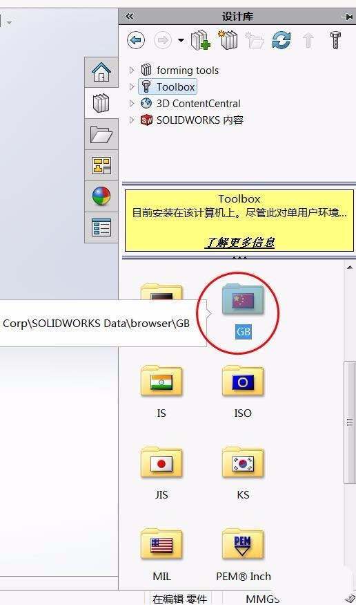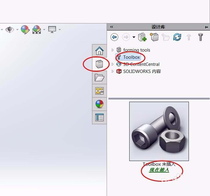1、打开solidworks最右侧的书本的形状,选择toolboax,在下册选择现在插入