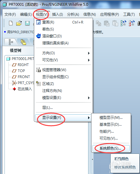 1、打开Pro/E软件,依次点击“视图”-“显示设置”-“系统颜色”。