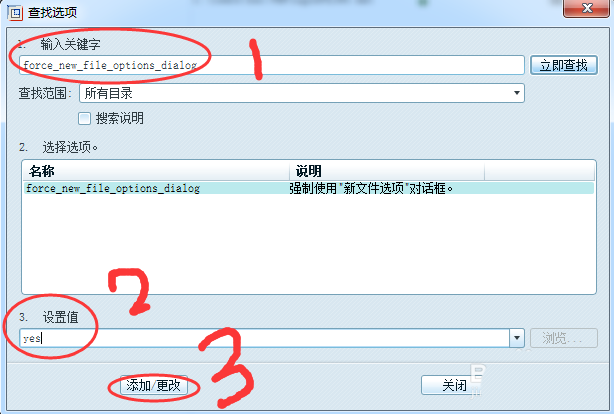 4、输入关键字“force_new_file_options_dialog”,或输入部分单词,通过查找找到该项,设置值“yes”,点击“添加/更改”