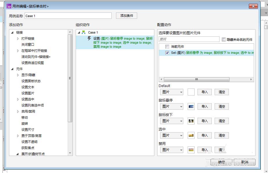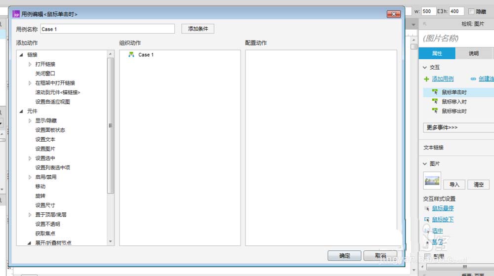 3、选中图片元素,添加鼠标单击时用例,打开用例编辑窗口,进行设置,如下图所示: