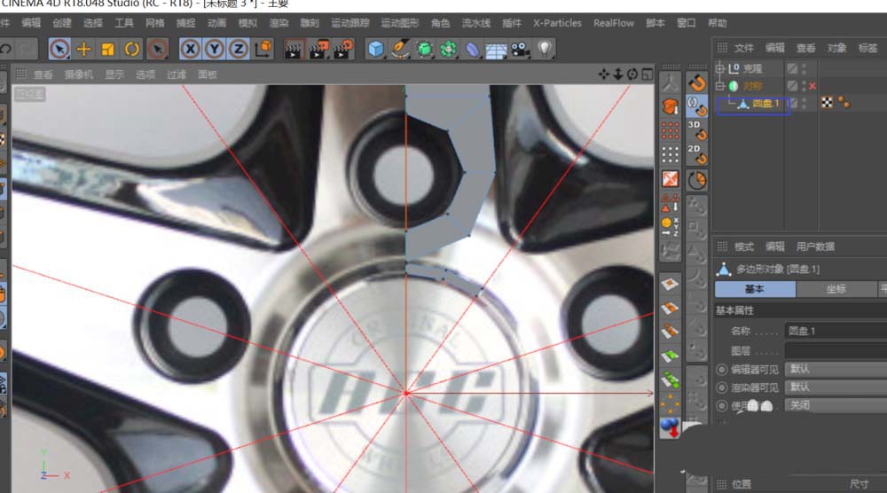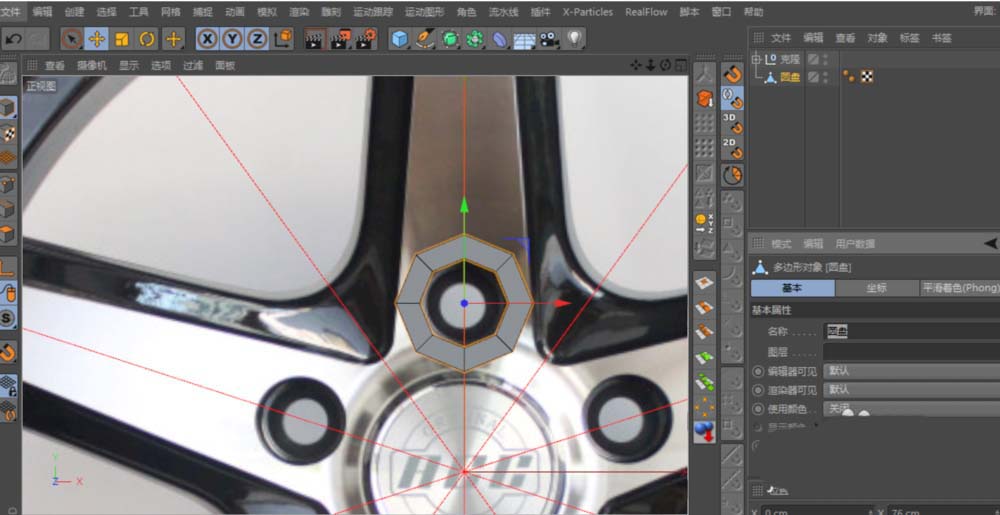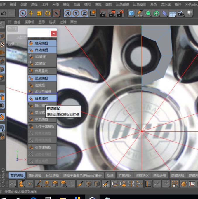 4、再建一圆盘,其分段与上一圆盘相同;它的位置是汽车轮毂中心盖LOGO的孔位,调整好后C掉,与上一圆盘“合并+删除对象”,利用“连接”与“多边形 画笔工具”对二个多边形进行整合;此时要开启捕捉工具,选用其中的“样条捕捉”,其作用就是当建立的点属于与辅助线共线时使用。