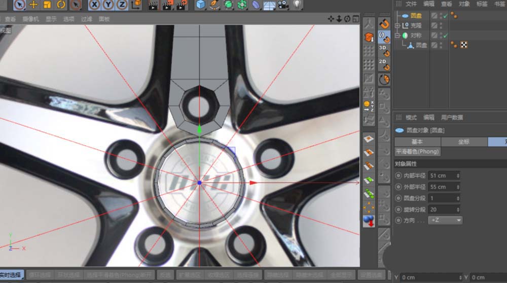 3、从汽车轮毂的螺丝孔位开始建模,从Y轴的正上方开始,建一圆盘移动到螺丝孔位,调整内圆刚好在螺丝孔的最大孔处,外圆侧刚好与汽车轮毂凸起面的边对齐,圆盘分段为1,旋转分段为8,C掉圆盘;这里可以用到“对称”,删除圆盘的一半添加“对称”;用缩放调整圆盘上方三点成直线,通过线模式按住“Ctrl"复制拖拉出与汽车轮毂凸起面对齐的多边形面(四段左右就可了,尽量少),点模式下,调整点的位置与汽车轮毂凸起面相应点对齐。