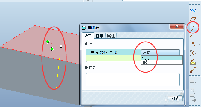 2、如下图,要在长方体上表面中心位置创建一根基准轴,先选取上表面,然后点击工具栏中的基准轴图标,弹出基准轴窗口如下,选法向。