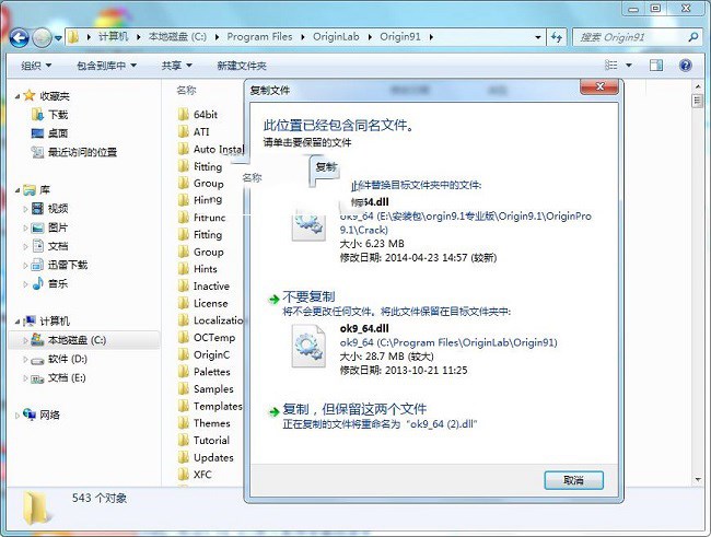 1、根据相应的操作系统,将Crack文件中的相应文件复制到程序的安装目录中,默认路径为C:\Program Files\OriginLab\Origin91