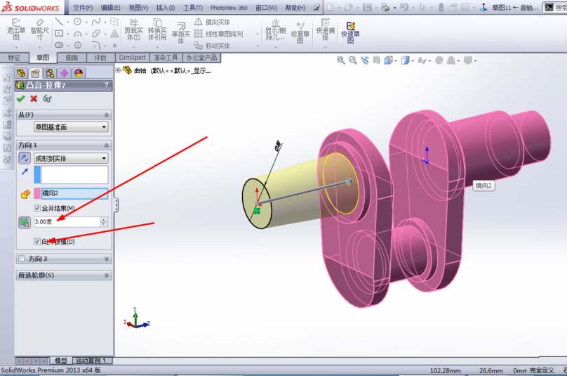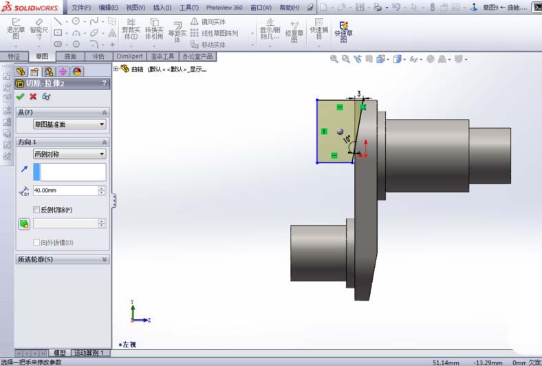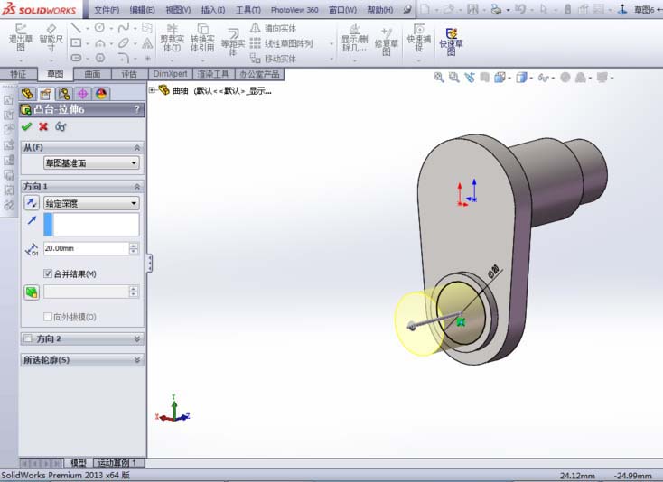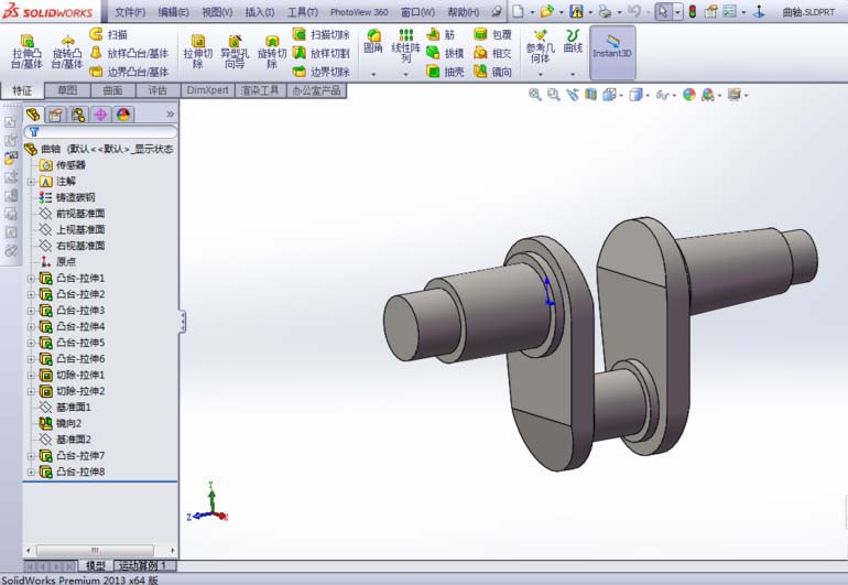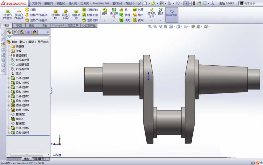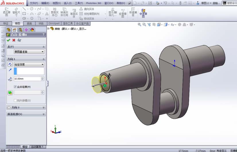 12、创建拉伸凸台8,距离为10mm,完成曲轴建模