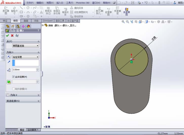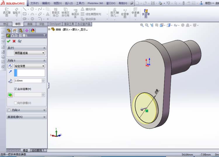 5、创建拉伸凸台5,给定深度为3mm,如下图所示