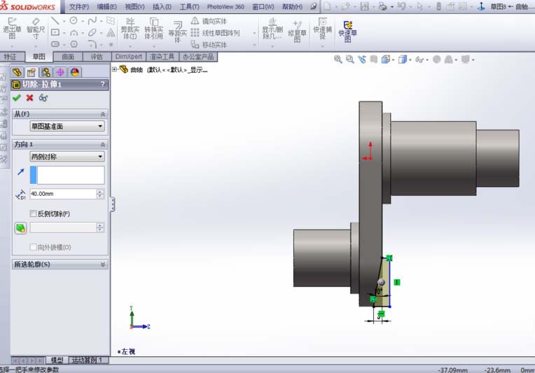 7、创建拉伸切除1和拉伸切除2,方向为两侧对称,距离为40mm