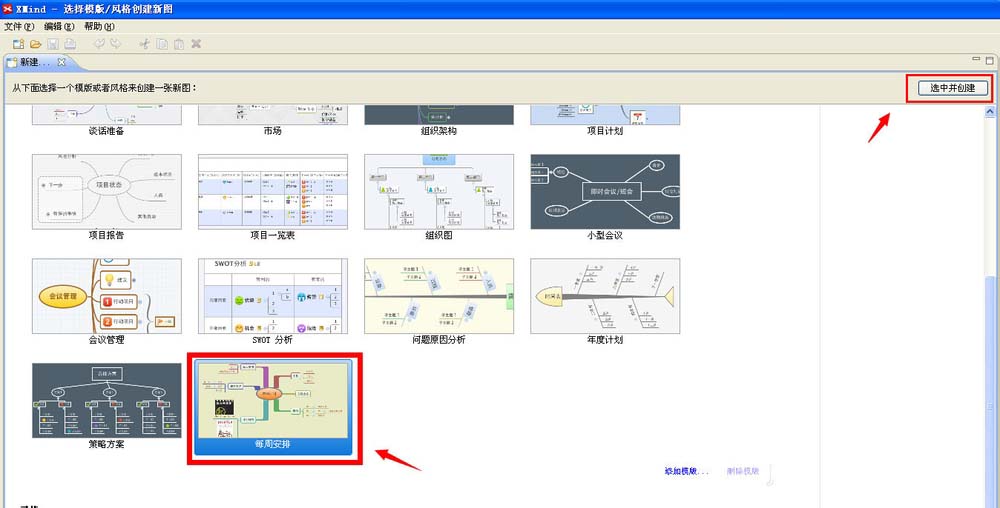 1、打开XMind后,选择“每周安排”的模板来进行套用和创建,双击选中并打开每周安排模板,然后单击选中,然后再点击右上角的“选中并创建”按钮。(如下图)