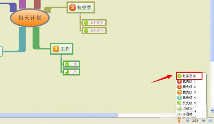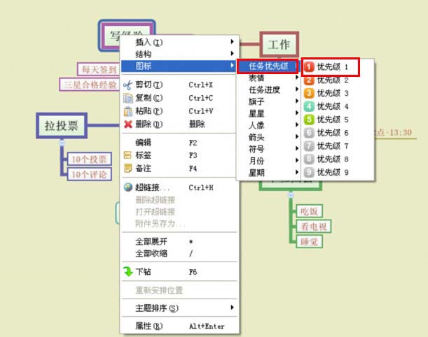 4、在每天计划的子主题中,点击鼠标右键进行图标优先级的标记。(如下图)