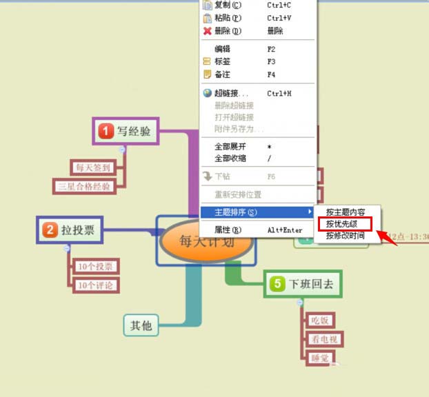 5、还可以点击鼠标右键,进行按优先级的主题排序选择,这样可以根据这些图表来指导每天的工作。(如下图)