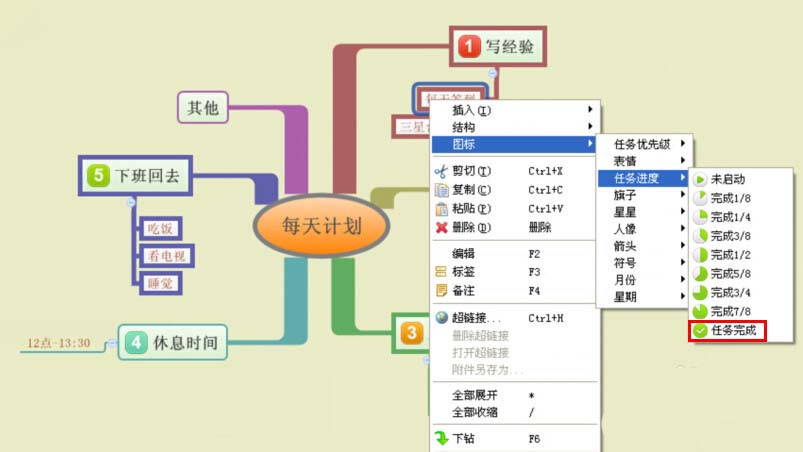 6、还可以对每天计划子主题的下一级子主题中的每天具体的工作进行任务进度的标记,点击鼠标右键,在图标下选择任务进度,然后按完成情况程度进行标记。(如下图)