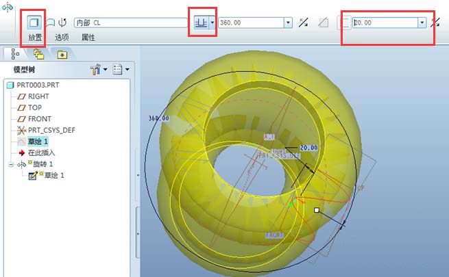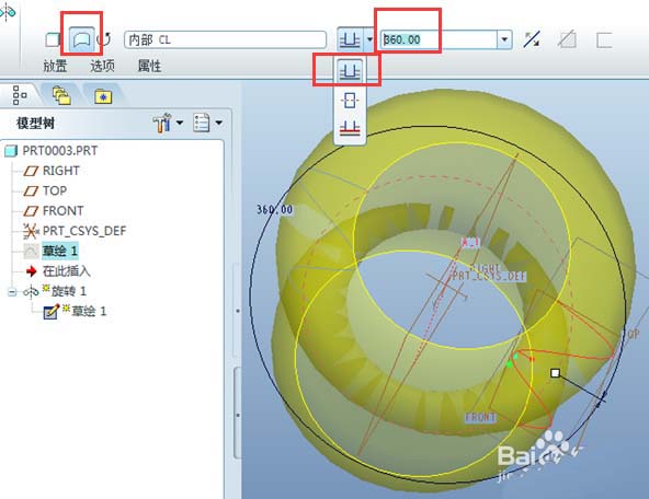 4、旋转成整圈实体。选择“作为实体旋转”按钮,下图第一个红色框;旋转方式选择第一项“从草绘平面以指定的角度值旋转”,下图第二个红色框,角度值输入360°(默认值)即可形成整圈实体;输入实体的厚度,注意旋转和厚度的方向,结果如下图。