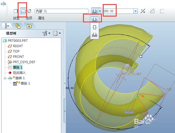 3、旋转成不封闭曲面。选择“作为曲面旋转”按钮,下图第一个红色框;旋转方式选择第一项“从草绘平面以指定的角度值旋转”,下图第二个红色框。角度值按实际需要输入即可,例如输入280°,形成不封闭曲面如下。
