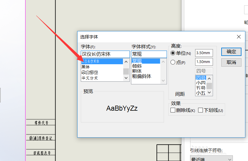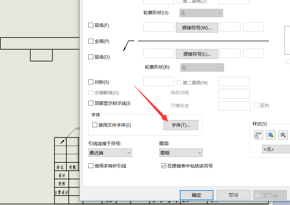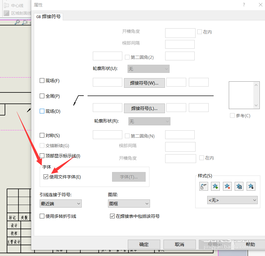 3、点开焊接符号之后,在弹出来的选择框里可以找到字体,把字体前面的勾去掉。
