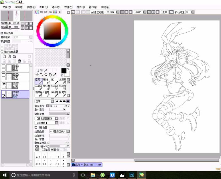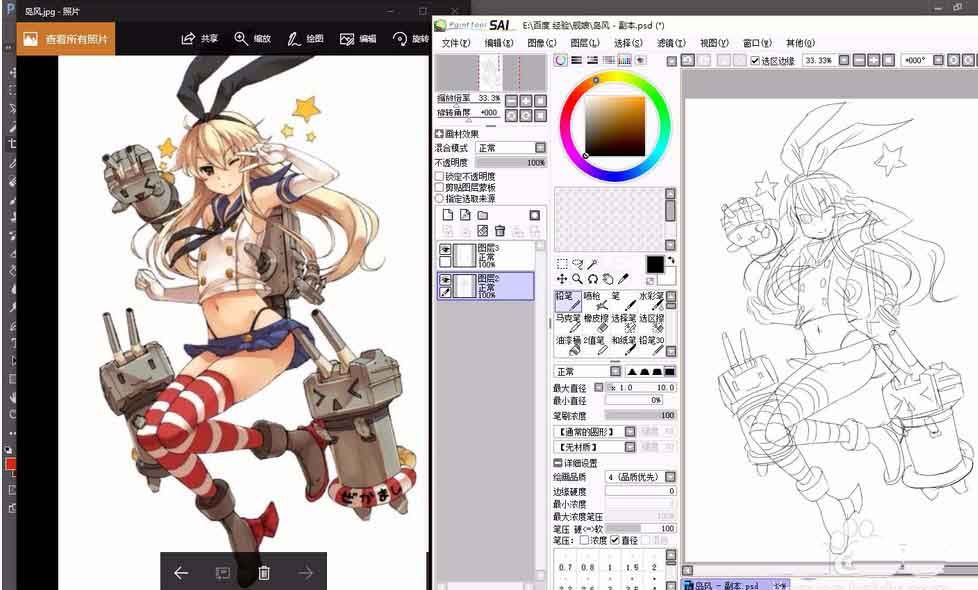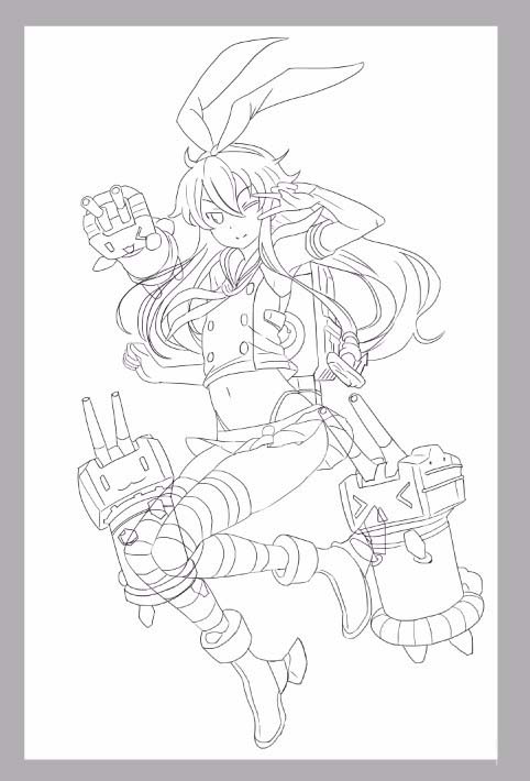 2、在网上找到一张舰娘岛风的图片,参照此图片,在sai中新建图层,用铅笔工具绘画出大体形态。