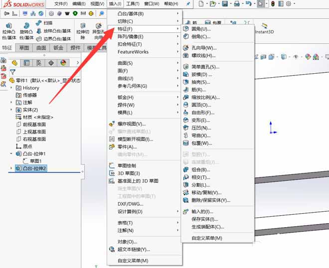 2、插入下可以找到特征,这个特征和我们工程图工具栏里的特征可不一样。