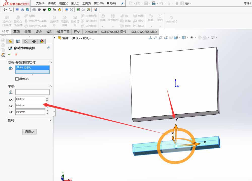 5、然后这个时候我们可以看到图上有三个箭头,代表了XYZ三个方向。而在左边一栏还有一些数值,改变这些数值就能让零件向你要移动的方向移动过去。