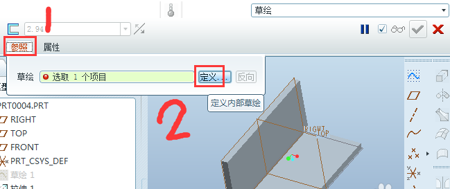 3、系统打开如下所示的“筋”控制面板,点击“参照”(step1),然后点击“草绘”后面的“定义”(step2)。