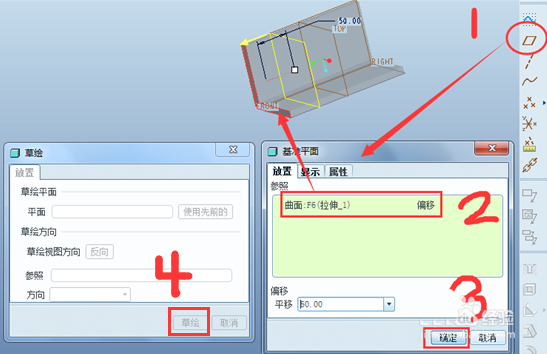 4、系统弹出如下图左半部分的“草绘”对话框,此时点击工具栏的“基准面”按钮(step1),弹出如下图右半部分的“基准平面”对话框,“参照”处选取L形实体的左端面(step2),偏移距离输入50,点击“确定”(step3),形成一个临时基准面,然后点击“草绘”(step4)。