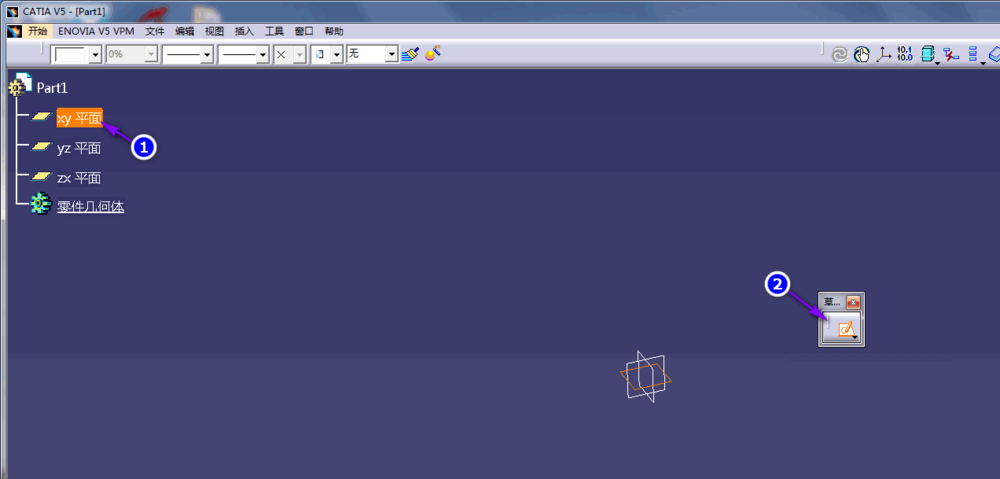 1、首先让我们来打开CATIA软件,进入零件设计模块,在左上角树形结构图或者在视图区选择xy平面,单击草图命令进入草图界面;