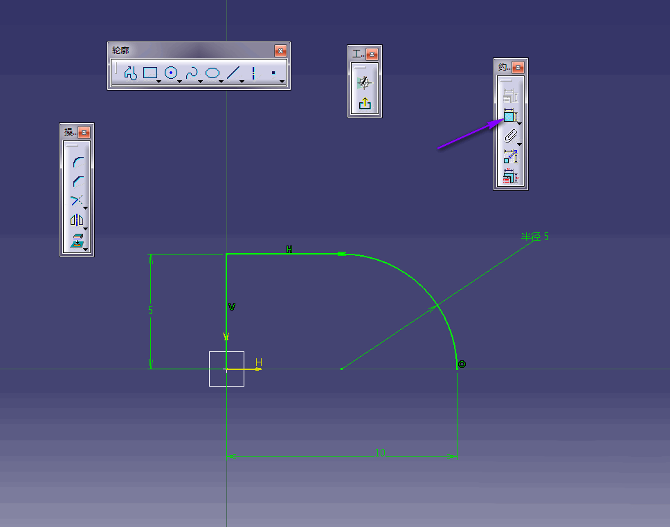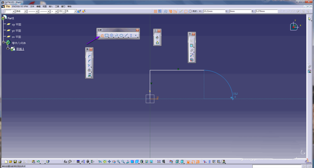 2、先通过轮廓命令绘制一条多线段,如下图所示,轮廓以原点为起始点,包含两条直线段和一条1/4圆弧;