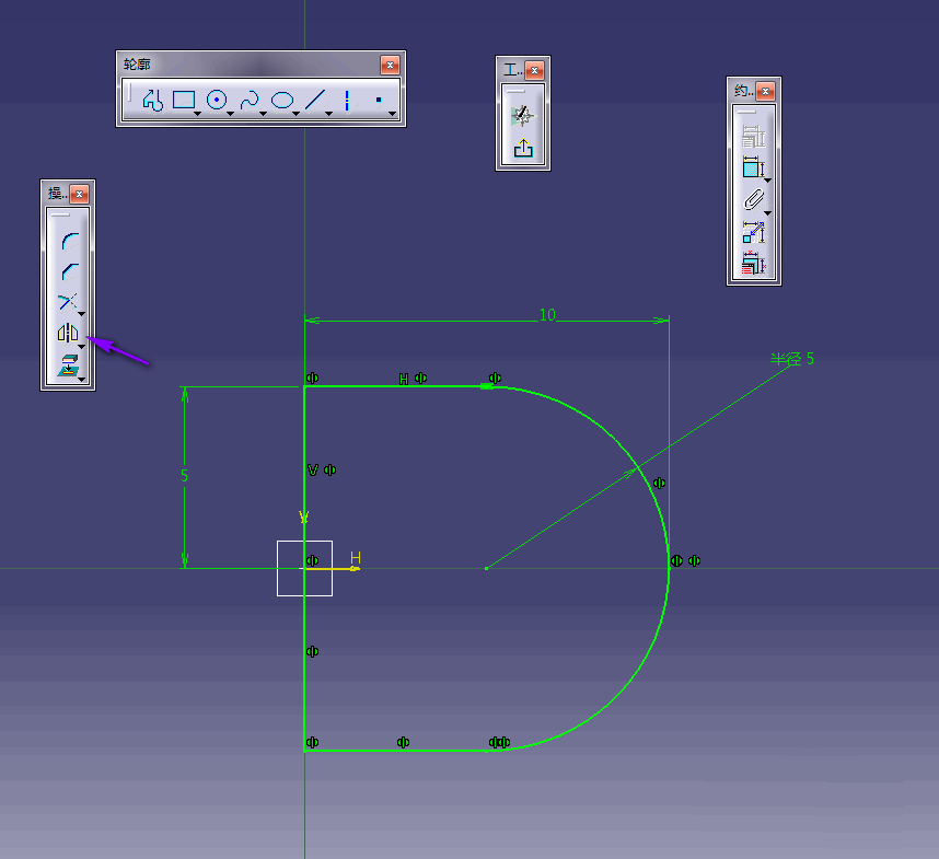 3、单击约束命令,对视图中的多线段进行全约束,当视图中的多线段颜色显示为全绿色时说明草图已经被全约束了;