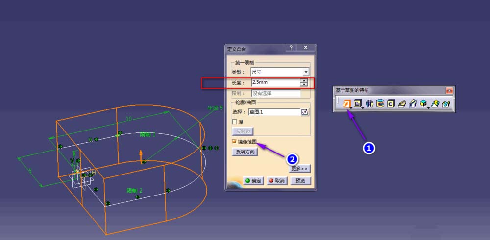 5、退出草图界面,单击凸台命令,并在弹出的对话框中定义凸台的类型、长度以及镜像范围等,单击确定退出命令对话框;