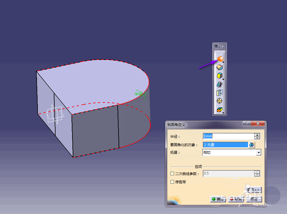 6、单击倒圆角命令,并将圆角定义为1mm,选择要圆角化的边线为图示两条边线,单击预览并确定;