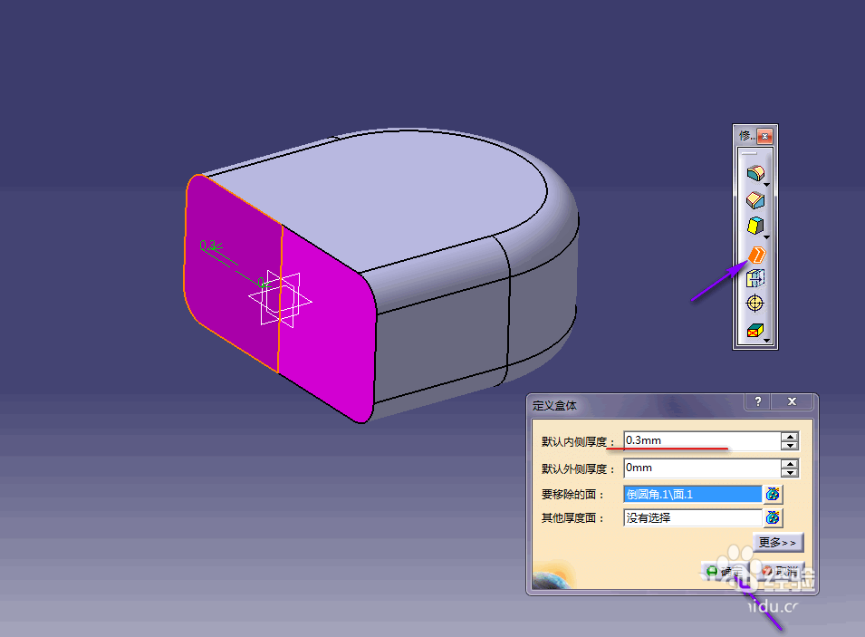 7、继续选择盒体命令,对实体进行抽壳操作,在命令对话框中设置抽壳的厚度为0.3mm,并在视图区选择要移除的面,单击确定完成所有操作,这样我们就完成了对一个简单三维实体的创建工作。