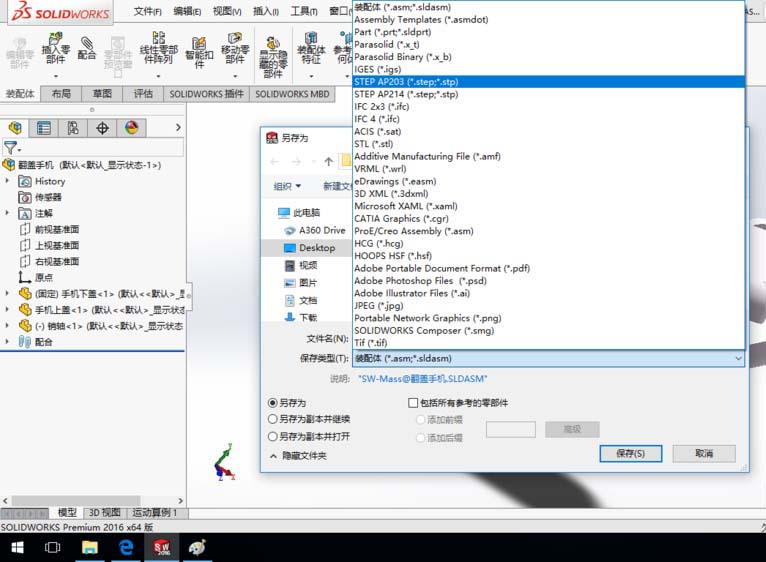 2、在弹出的另存为对话框中,选择保存类型为“STEP AP203(*.step;*.stp)”。