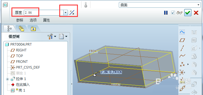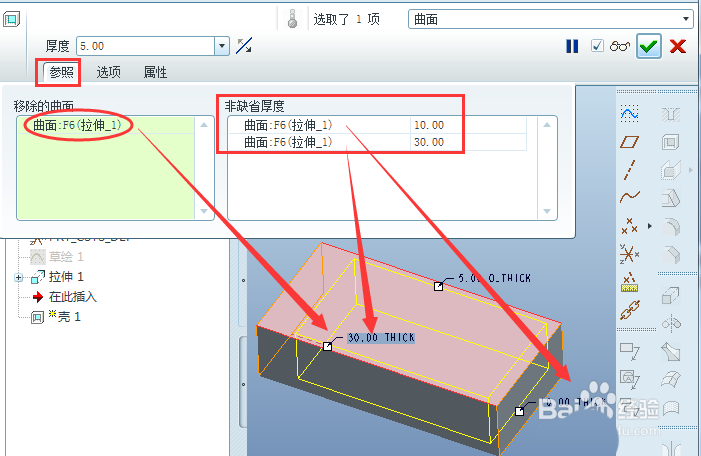 5、除了上述封闭等厚抽壳外,也可创建不同壁厚开口壳特征。方法为:右键单击上述壳特征,或者右键点击模型树的“壳”,弹出列表中选择“编辑定义”,进入“壳”的控制面板如下。“移除的曲面”选择上表面,“非缺省厚度”拾取左面和右面,厚度定义为30和10,按√完成。