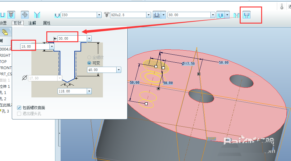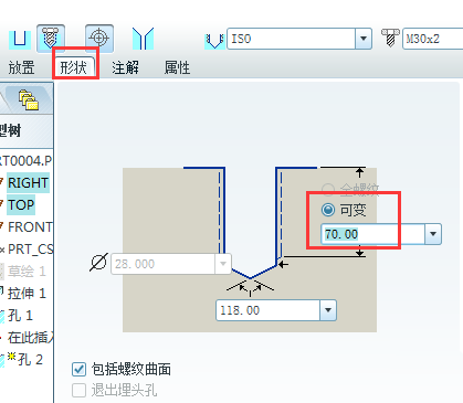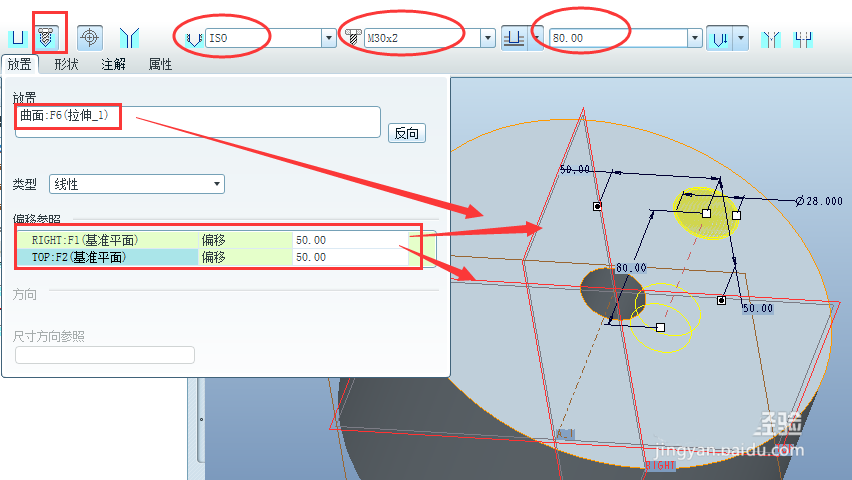 1、新建孔特征,系统弹出如下图所示“孔”的操控面板,选取“创建标准孔”按钮(下图中左上角小方框内),放置处选取上表面,偏移参照选取两个基准面且偏移距离都为50,定义好孔M30x2和孔深80。