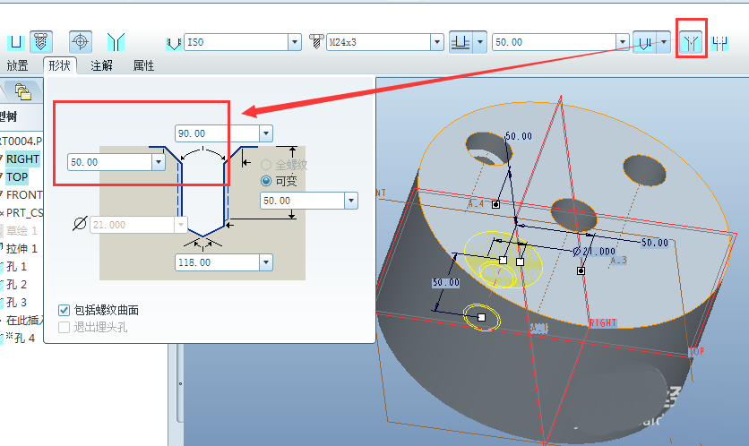 简单孔只需定义孔的位置、直径和深度即可,方法如下。