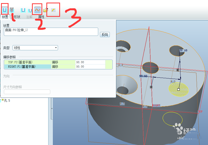 1、新建孔特征,系统弹出如下图所示“孔”的操控面板,选取“创建简单孔”按钮(step1),定义好孔的位置(方法与上述类似),点击“草绘”按钮(step2),然后点击“创建截面”按钮(step3)。