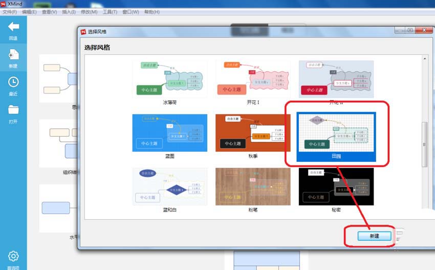 2、接着,选择思维导图的风格,这里选择了“田园”风格,选好风格后,单击“新建”按钮,进入下一步,如下图所示: